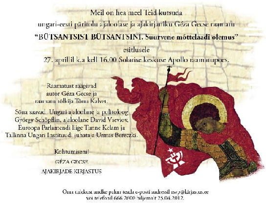 2012. április 27-én Tallinnban, a Solaris Üzletközponthoz tartozó könyvesboltban (Solarise keskus, Apollo, Estonia pst 9 Tallinn 10134) Gecse Géza Bizánctól Bizáncig c. könyvének átdolgozott és kibővített észt nyelvű változatát mutatja be a Tallinni Magyar Intézet és a Ajakirjade Kirjastus Kiadó.