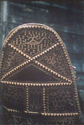 "Ez egy Kazõmi hanti gyerek nappali bolcsoje. a hátoldalán talaható fratria totemállat, melynek a feladata az, hogy védje a csecsemő nappali álmát a gonosz szellemektől. A kepen fiúgyermek bölcsője látható, amire abból tudunk következtetni, hogy a madár hátrészén talalható háromszög üres es a közepső rész közepső kockájában moipõr – vagyis medve-ábra helyezkedik el. A kép 1970 augusztusában készült az Amnja nevű faluban.